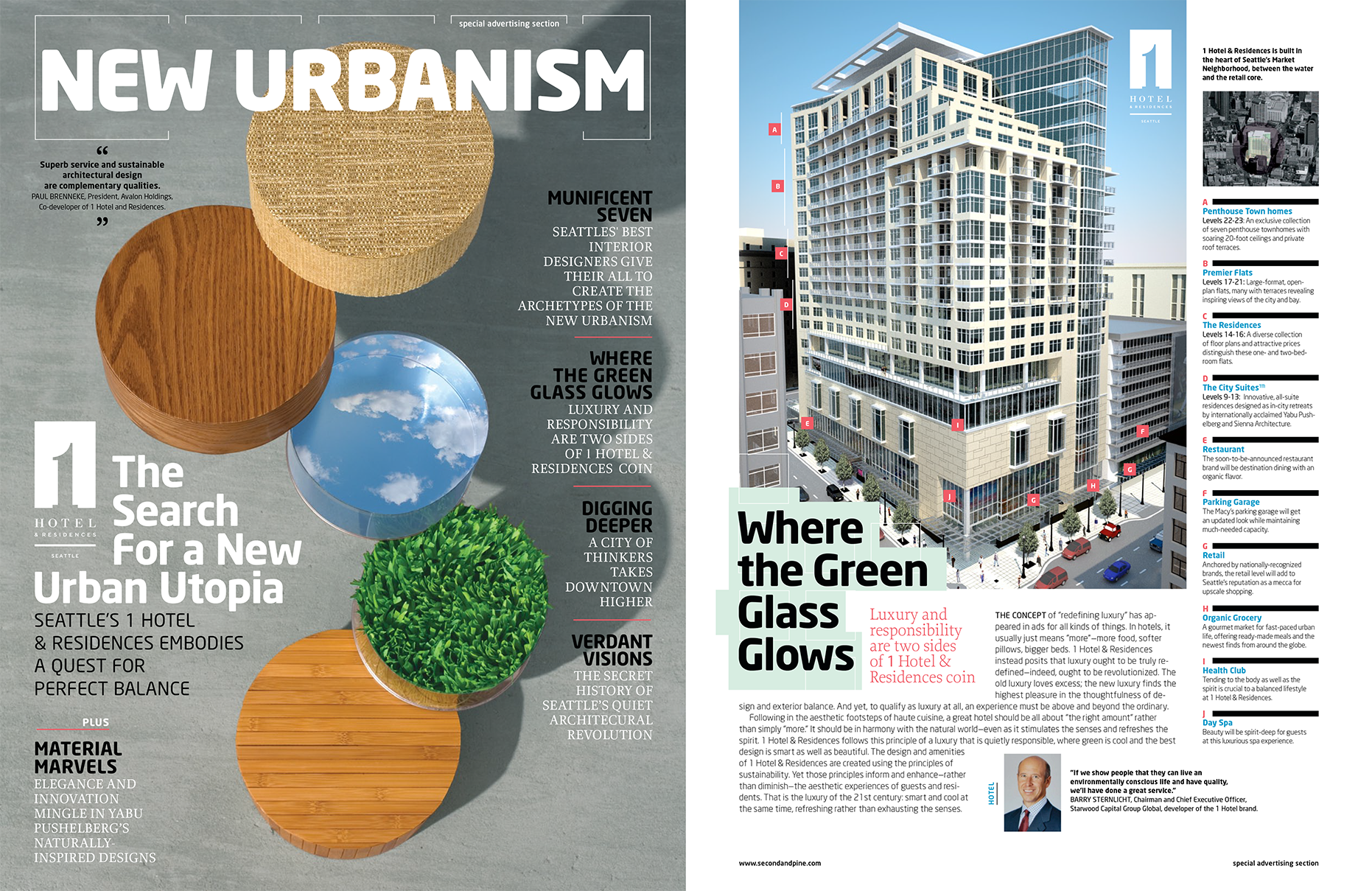Commissioned to design a special advertising insert for the launch of Starwood's green hotel and residences — produced in partnership with Realogics, Seattle's premier full-service real estate consultancy.