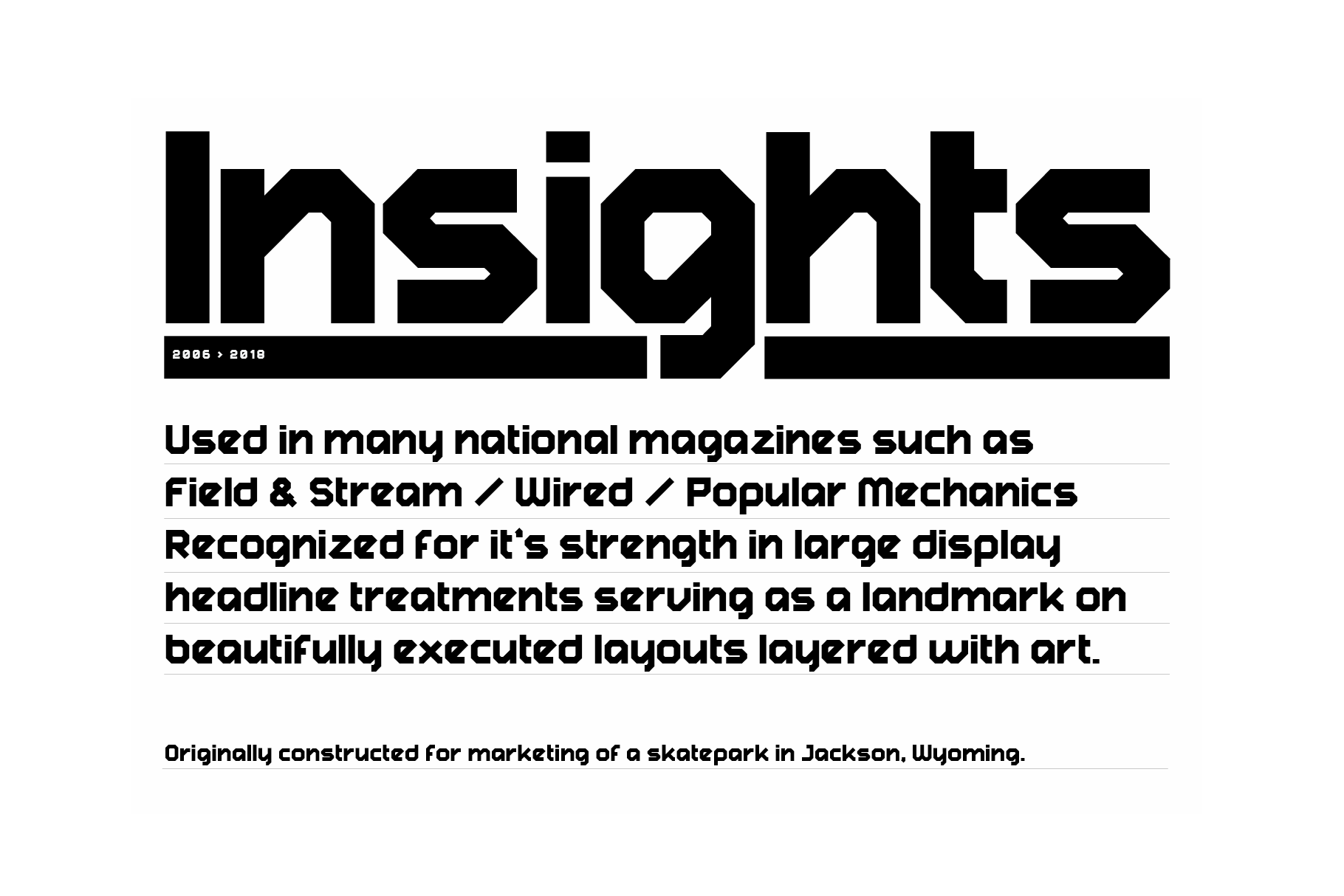A typographic startup born from a genuine obsession with type — Weapon of Choice was a boutique foundry offering bespoke fonts for a niche clientele of custom commissions and retail licensing. As founding partner and creative director, I designed the website, developed half of the typefaces in the library, managed payments, maintained the site, and handled promotion. In its first year profits scaled 500%, earning a Type Directors Club recognition for best website. Building something from nothing — business structure, creative output, and client development — demands a different kind of rigor than client work.